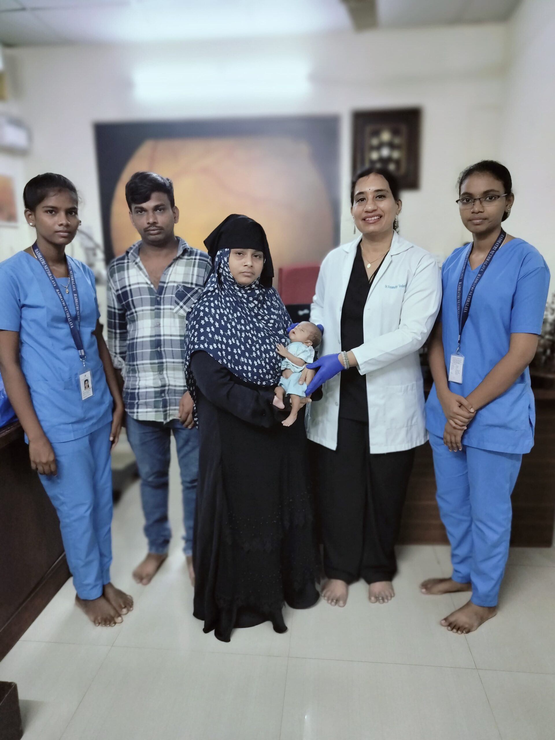 A preterm baby from Nellore, Andhra Pradesh, born to underprivileged parents who eke out a living as fruitsellers, developed a severe form of Retinopathy of Prematurity (ROP), a blinding disease affecting preterm babies. As Laser and Intraocular injections did not suffice, it underwent suture-less, advanced, keyhole, lens sparing vitrectomy surgery in both the eyes under general anaesthesia at Radhatri Nethralaya.