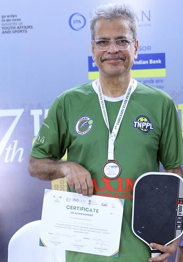 Kothandaraman Vasudevan, (a resident of Iyyapanthangal) won gold in the 60+ Men’s Singles and bronze in the 50+ Men’s Doubles events at the 7th Tamil Nadu State Level Pickleball Championship conducted by Tamil Nadu Pickleball Association (TNPA), a member of the Indian Pickleball Association. This 4 day spectacle concluded on September 14. A mega event with close to 500 men and women participants in the age group of 5 to 78, this was held at the Pickler’s Arena, Iyyapanthangal. Pickler’s Arena with its 6 brand new courts, has the largest and best laid courts (to international court specifications) and pickleball complex in Chennai and Tamil Nadu. Pickleball is currently the fastest growing popular racket sport across the world and India. Easy to learn and fun to play, it offers an excellent health and fitness work-out and lots of opportunity for happy socialising.
