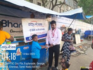 Equitas Development Initiatives Trust (Anna Salai) celebrated Children’s Day alongwith pavement dwellers children on Nov.14 at Broadway Bus Depot. They provided note books and snacks to the children. M. Krishnamurthy (CSR Manager, Equitas) coordinated the event.