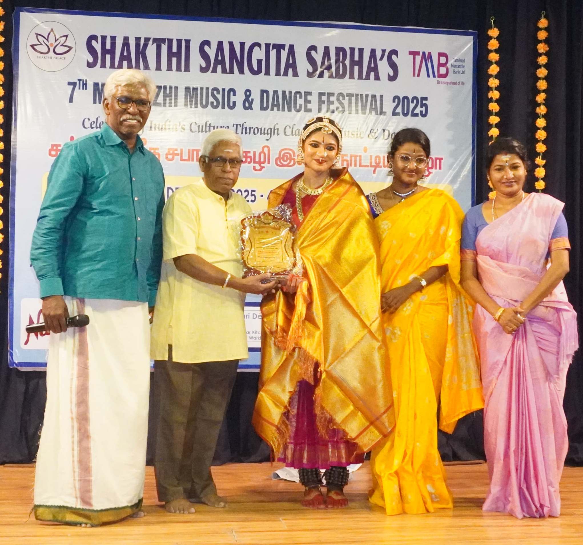 Dhanyavarshini, Disciple of Guru K.P. Gokila Vani of Madurai Prashitham Natyakalalaya, performed solo on Jan.7 at the Shakti Sangita Sabha, Valasaravakkam. The recital was graced by the distinguished presence of Ramki (residing in Porur), Editor of the magazines Paattum Bharathamum, Malarvanam, and Mixed Bag, and Manikkavasagan, the driving force behind Shakti Sangita Sabha and K.P. Gokila Vani attentively witnessing the performance. The repertoire at Shakti Sangita Sabha showcased depth and classicism, highlighted by the revered varnam “Innum En Manam” in Charukesi, composed by Sri Lalgudi Jayaraman. At the conclusion of the recital, Ramki honoured Dhanyavarshini with a shawl on behalf of Paattum Bharathamum, appreciating her performance and commitment to classical dance and Manikkavasagan felicitated the young dancer with a memento shield of Shakti Sangita Sabha, acknowledging her quality of the presentation.