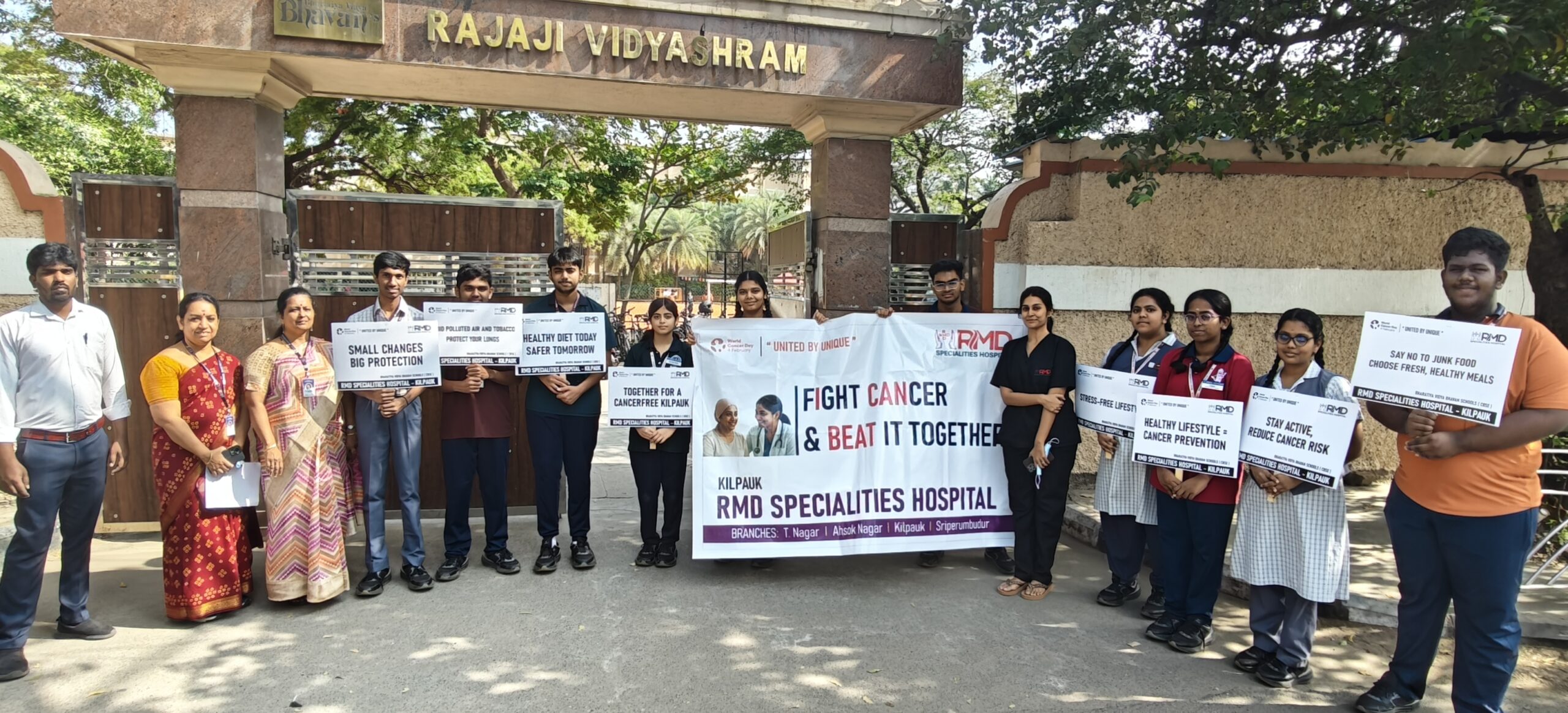 On View of Cancer Awareness Day, Doctors, Nurses from RMD Specialities Hospital and Students of Bharathiya Vidya Bhavan’s Rajaji Vidyasharam Kilpauk conducted awareness program outside the school premises on Kilpauk Garden Road, Kilpauk