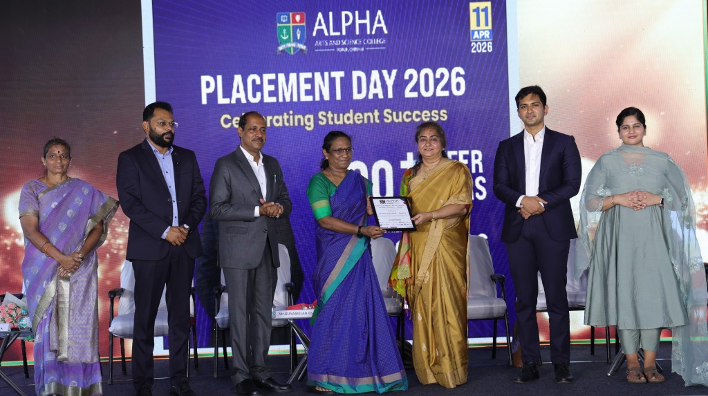 The Placement Report was then presented by A. Rakeshkumar, Manager – Training and Placements, Alpha Group of Institutions, showcasing the outstanding achievements of the 2026 batch. During the academic year, the Training and Placement Cell successfully conducted 41 campus and off-campus drives, spanning diverse sectors such as IT, ITES, BFSI, Healthcare, Core, and Media. As on April 11, students had secured 903 offer letters, with 442 students successfully placed. The report also highlighted the institution’s major recruiter partnerships, including TCS, Data Pattern, Infinite Computers, Movate, City Union Bank, NTrust, News7, SoftRate, Sutherland Global, K-12 Techno Services, Asahi India Glass Ltd., Adams Bridge, Omega Healthcare, and many other esteemed organizations.